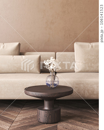 Japandi boho beige interior with lounge sofa and dry flower in vase background. Light modern australian livingroom closeup. 3d rendering mockup. High quality 3d illustration
