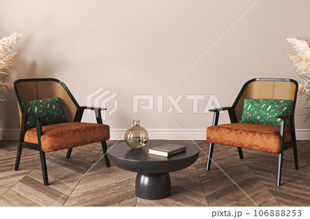 Japanese beige interior with bright orange armchair and dry plant. Light nature scandi livingroom panoramic background. 3d rendering mock up. High quality 3d illustration