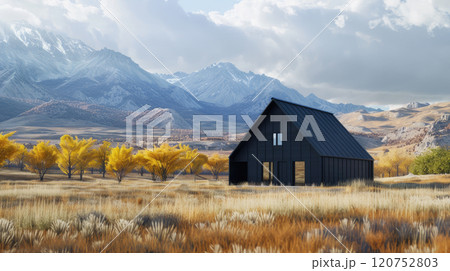 Modern black frame house in a open field in front of rocky mountains at autumn season.