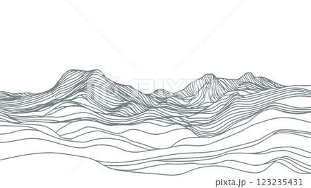 Abstract mountain landscape illustration. Wavy contour lines create depth and texture. Nature, geography, and topographic design concept. Minimalist line art drawing background