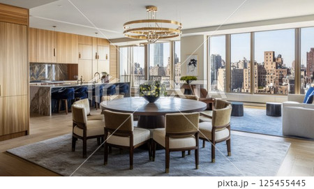 Luxurious modern apartment with open-plan kitchen, dining area, and city views.