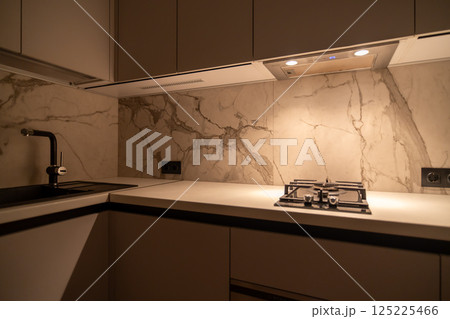 Marble Kitchen Backsplash, Modern Design, Interior Lighting: Luxury Apartment Kitchen, Evening.