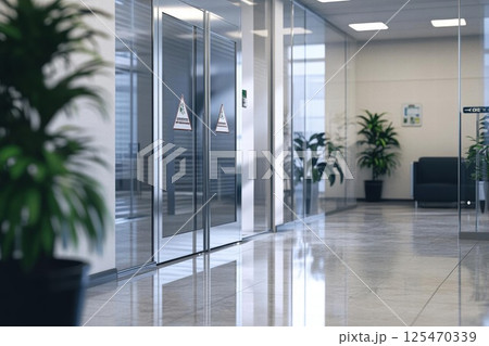 Modern Office Interior Design with Glass Doors and Potted Plants, Creating a Welcoming