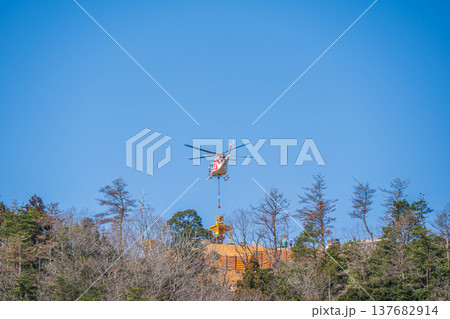 山の上で作業に従事するヘリコプター 滋賀県長浜市近江塩津
