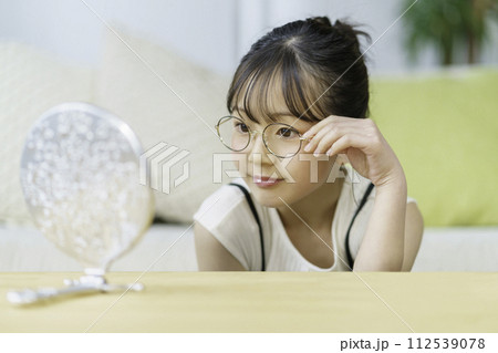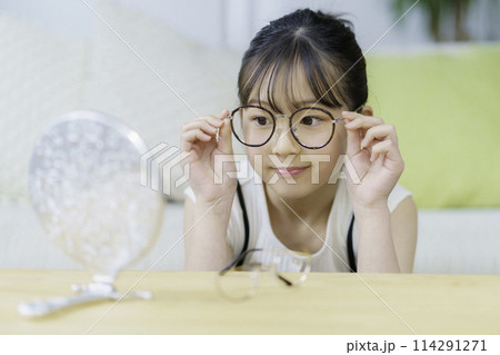 メガネをかけて鏡を見る困った顔の小学生の女の子