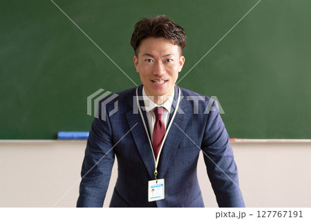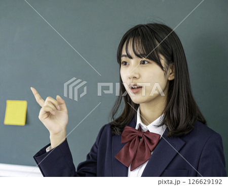 伝える笑顔|黒板の前で話す女子高校生の自然な表情