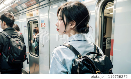 地下鉄の中に立つリュックを背負った若い女性の後姿,generative ai_ワイド