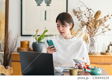 忙しい様子で朝食を食べる女性