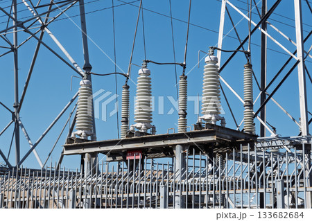 高圧送電線から地上の変電所への引込線に設置された巨大な絶縁碍子のアップ