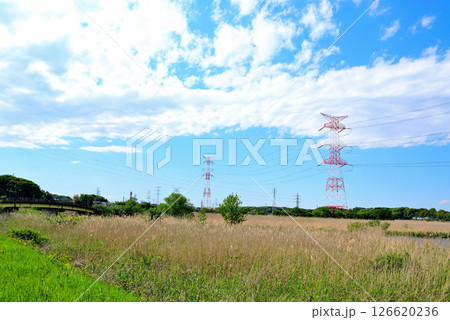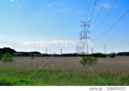 千葉県 手賀沼沿いに架かる架空送電線と鉄塔の風景