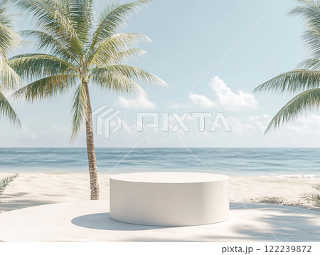 A serene beach scene with trees framing a circular white platform, surrounded by sand and tropical plants, with the ocean in the background.