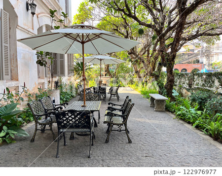 restaurant in the garden, Elegant outdoor patio with black metal chairs, large umbrellas, and lush greenery beside a historic building
