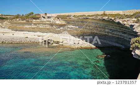 Stunning coastal landscape in Malta featuring layered limestone cliffs, secluded sandy cove, and crystal-clear turquoise waters under bright blue sky