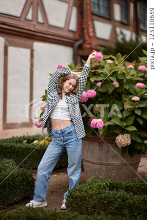 Autumn Fashion Portrait: Stylish Woman Amidst Blooming Hydrangeas at Traditional German Half Timbered House. Cozy Fall Outdoor Scene Showcasing Casual Outfit and Warm Colors in Picturesque Rural