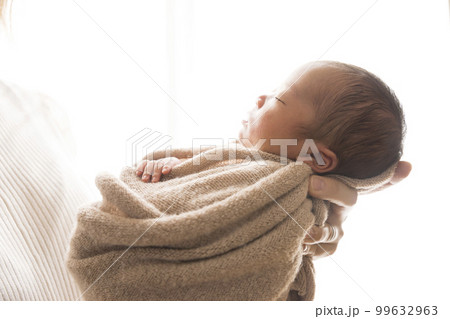 ニューボーンフォト撮影 赤ちゃんを抱っこする母親