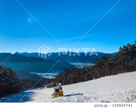 朝のスキー場から望む雪山と山麓の町並みの冬景色 (長野県、山ノ内町、夜間瀬)