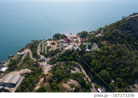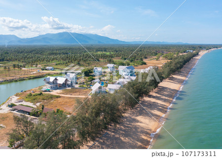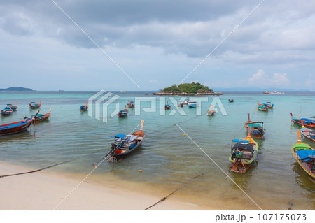 Aerial top view of tourist boats in beach shore, river, pond or lake in summer season. Nature landscape background, Thailand.