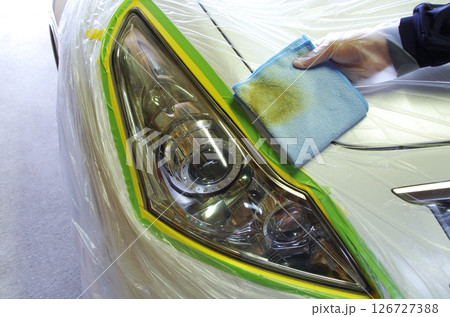ボディーの塗装面をマスキングテープで保護してから経年劣化で黄ばんだヘッドライトの表面を磨いている様子