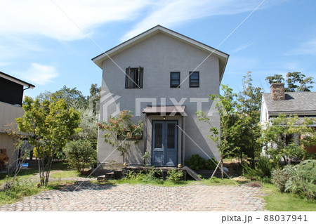 青空に映えるブルーの木製玄関ドアがかわいい落ち着いた色合いのレトロでおしゃれなカントリー風の邸宅