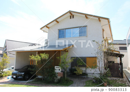 緩勾配の深い軒が美しい金属板葺きの玄関庇が特徴的なおしゃれで落ち着いた雰囲気の和モダンな邸宅