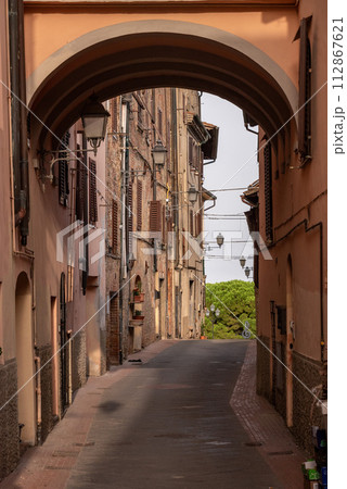 Stunning view of the roman aqueduct surrounded by colorful houses, Perugia, Italy