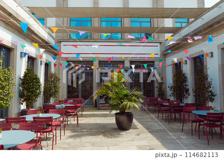 A courtyard, red chairs, and a large potted plant decorated for summer festival in June San Juan