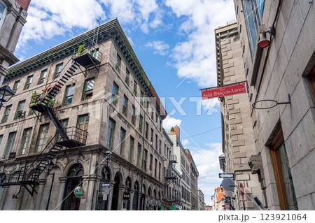 Street view in Old Montreal. Retro style building in Saint Paul Street West (Rue Saint-Paul). Montreal, Quebec, Canada.