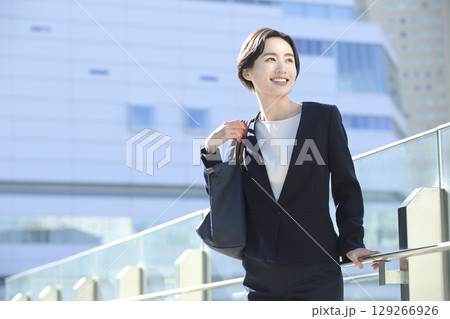 歩道を歩くスーツの女性