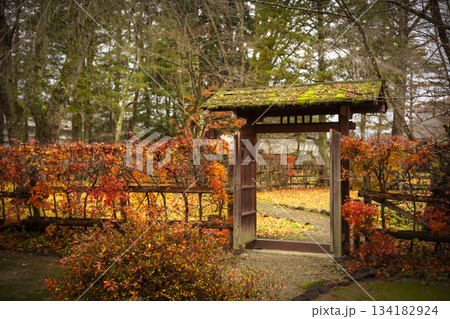秋田県角館武家屋敷の苔むす通用門と紅葉