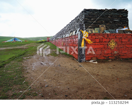 中国 青海省 チベット仏教寺院 和日寺のマニ石塚と石塚壁の碑