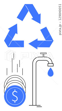 Recycling symbol, coins falling, and water drop from faucet. Ideal for environmental conservation, financial management, sustainable development, resource allocation, eco-friendly initiatives