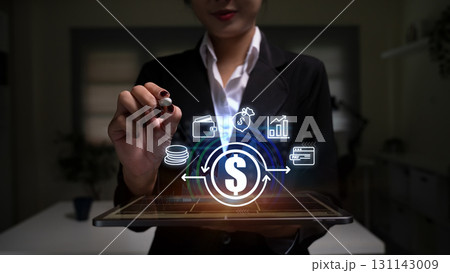 Futuristic fintech concept showing holographic currency symbols, digital wallet, and financial growth charts