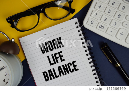 Work Life Balance text written on notepad with calculator and alarm clock on navy blue background