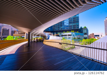 浜松町駅と竹芝を結ぶ屋根付きの高架型歩行者専用連絡通路(竹芝デッキ)