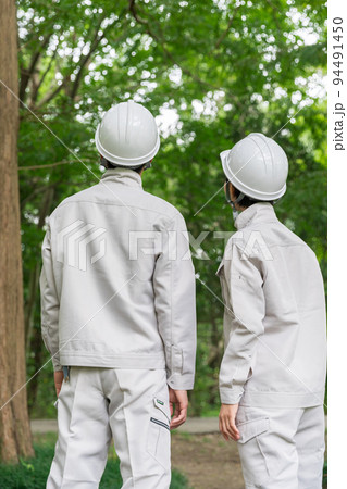 森の中で作業服を着た若い男女 後ろ姿