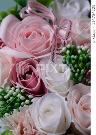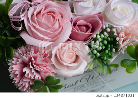母の母の日ギフトのフラワーアレンジメント・背景ピンク日ギフトのフラワーアレンジメント・背景ピンク