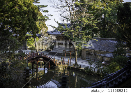 日本 三重県伊勢市朝熊町岳にある金剛證寺の仁王門と鐘楼と連間の池に架かる連珠橋
