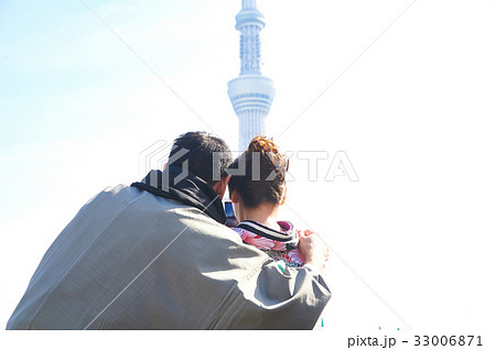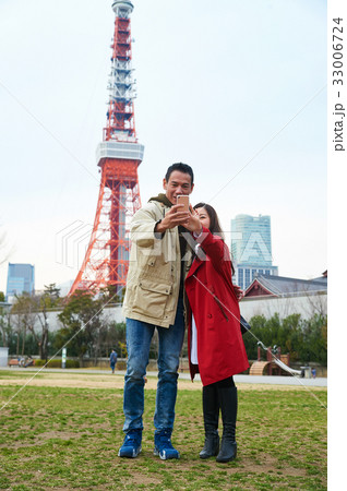 A happy couple is taking picture of skytree tower