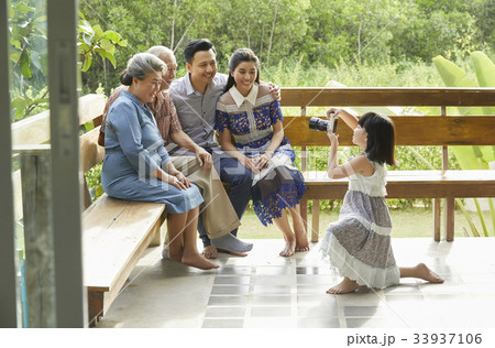 a little girl is taking a picture for her extended family.
