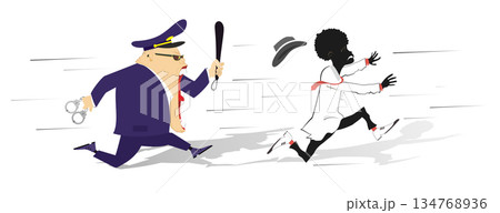 African man runs away from an angry policeman Police officer with handcuffs and baton trying to catch up an African man