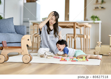 泣きじゃくる1歳半の息子をあやす母親