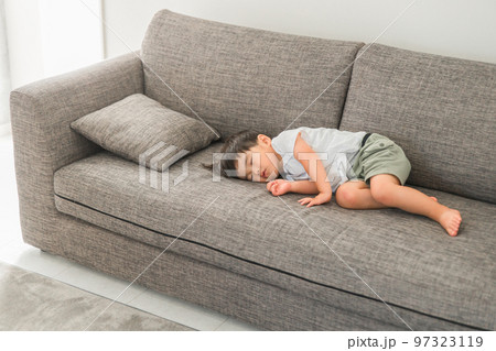 家のソファで寝るアジア人の子供(男の子・熟睡・睡眠・眠る・お昼寝)