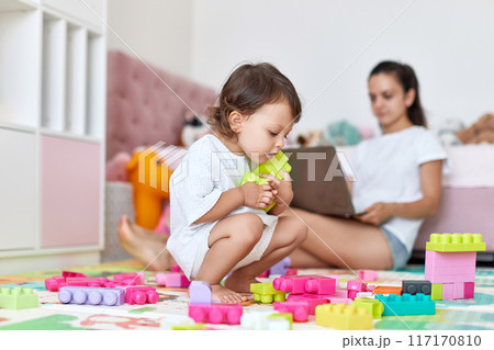 cute little baby girl playing with toys blocks and mother mother working on laptop from home