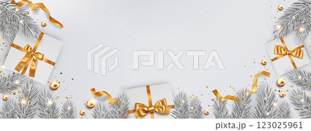 Watercolor seamless pattern New Year border with Christmas sugar candy, fir branches, gifts, clock, hat and Christmas balls. For invitations, cards, posters, seasonal decor, New year wrapping paper