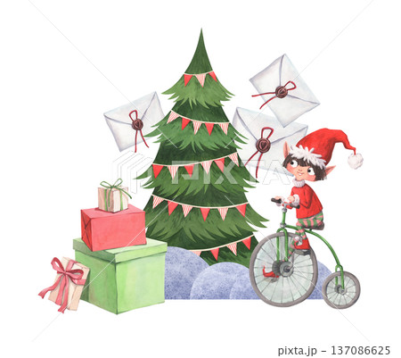 A festive watercolor composition featuring a Christmas elf on a bicycle