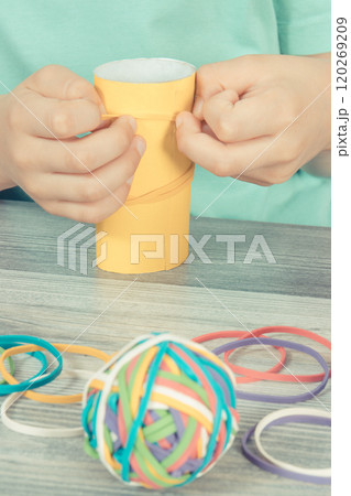 Preschooler hands putting rubber bands or erasers on cardboard roll