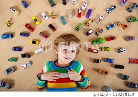 Lovely blond kid boy playing with lots of toy cars indoor. Happy healthy child boy having fun during pandemic coronavirus quarantine disease. Child alone at home, closed nursery.