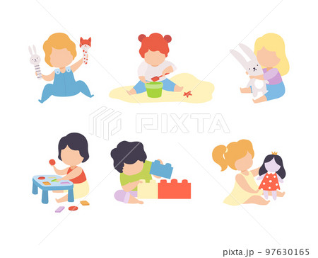 Baby Boy and Girl Sitting on the Floor and Playing Toys in Nursery and in Sandpit Vector Set