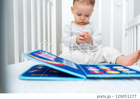 Baby playing with montessori busy book sitting in crib. Concept of smart books and modern toys