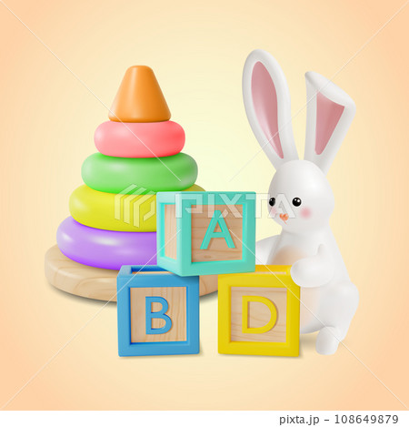 3d Kid Toy Concept Cartoon Style Include of Funny Bunny, ABC Block and Pyramid with Colorful Rings . Vector illustration